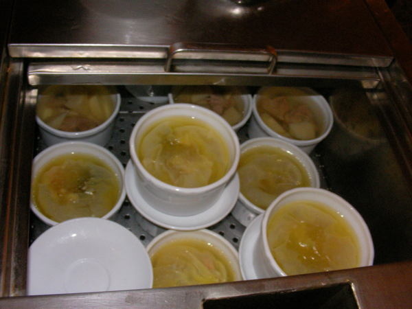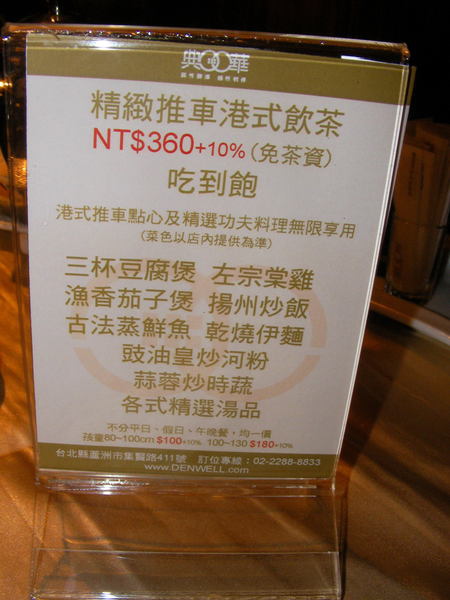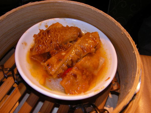菜色部分,比較推MENU上的主菜,可惜菜色並沒有很多;而推車的蒸籠部分,感覺上種類也不能說算是很多,感覺算是該有的都有,但有特色的或是感覺精緻的大概也只有蘿蔔糕勉強稱的上,但卻又遠不及新紅寶石的蘿蔔糕;推車的湯品感覺上樣式有很多選擇,這一點算得上是特色之一,而且大部分的湯品都還不錯喝;甜湯部分由於式自助式的,只要是渴了都可以馬上取用,不用再慢慢等候服務員送來,這一點算是不錯的動線配置。