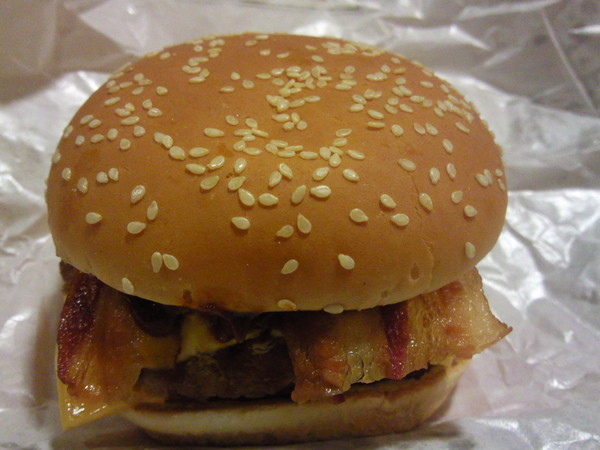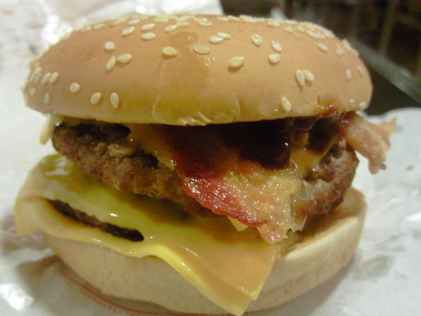 三層犇牛堡食材-由麵包、酥脆培根、美國乳酪、火烤牛肉片再