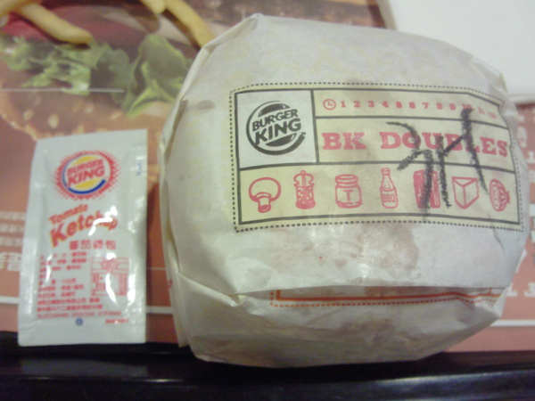 三層犇牛堡實體大小-拆開外包裝後再拿蕃茄醬包拿來比較一下