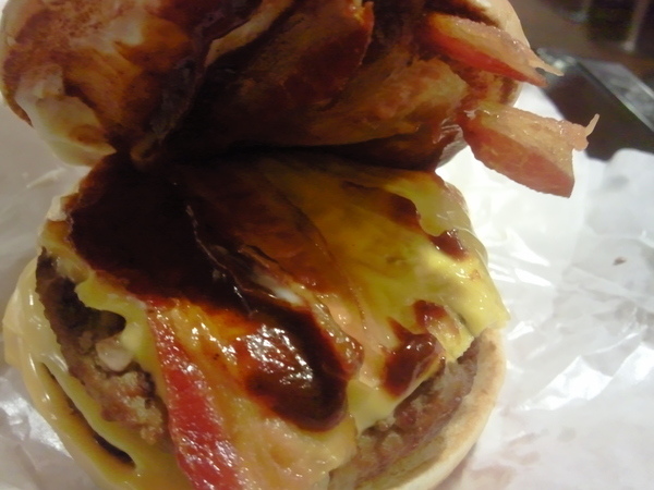 再淋上胡桃木煙燻BBQ醬所組合而成的這個三層犇牛堡,吃起