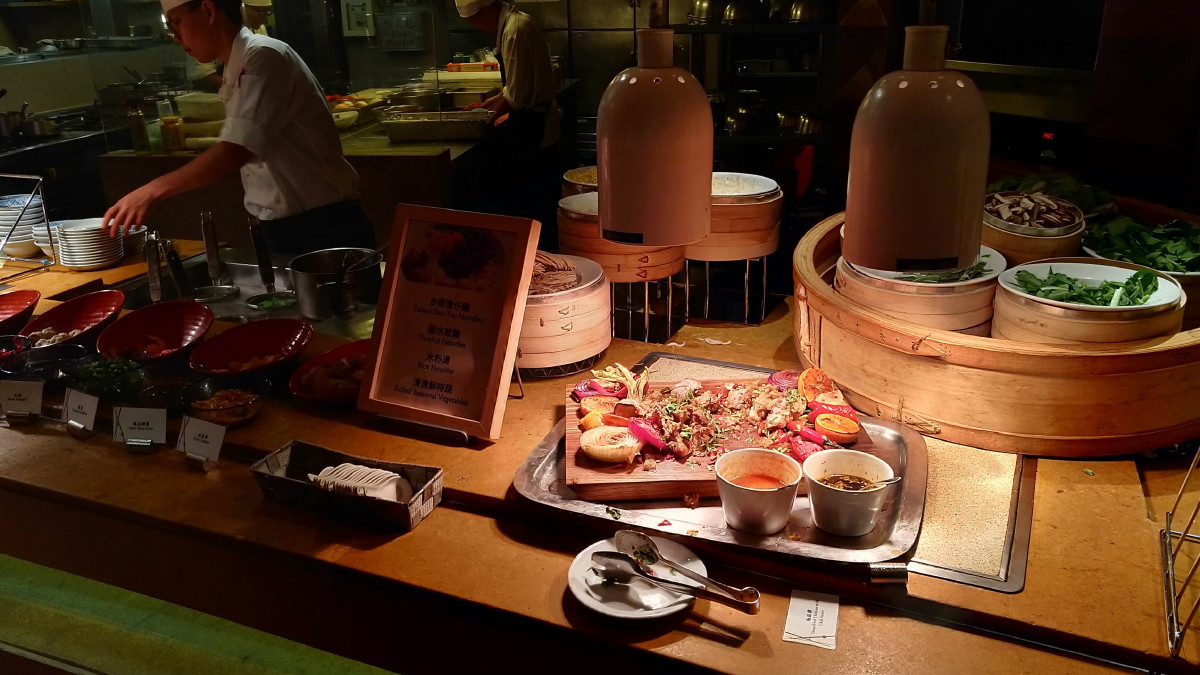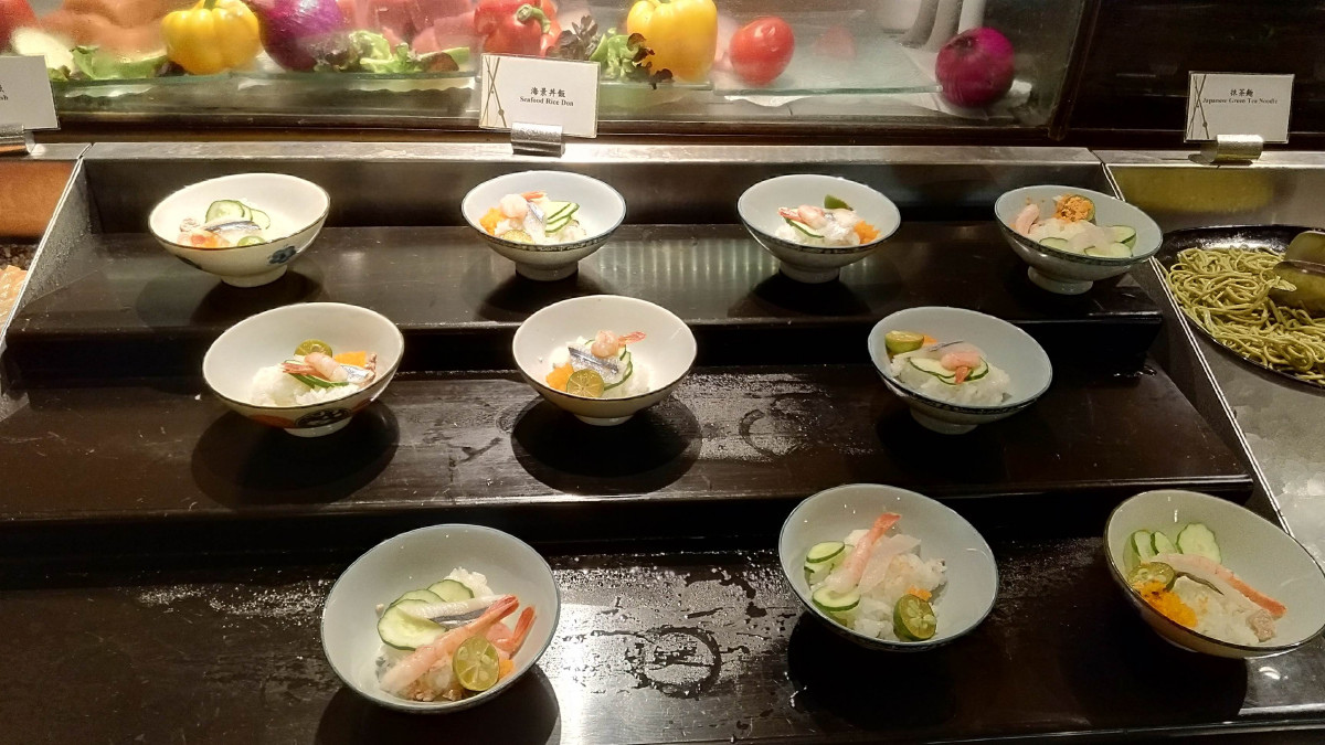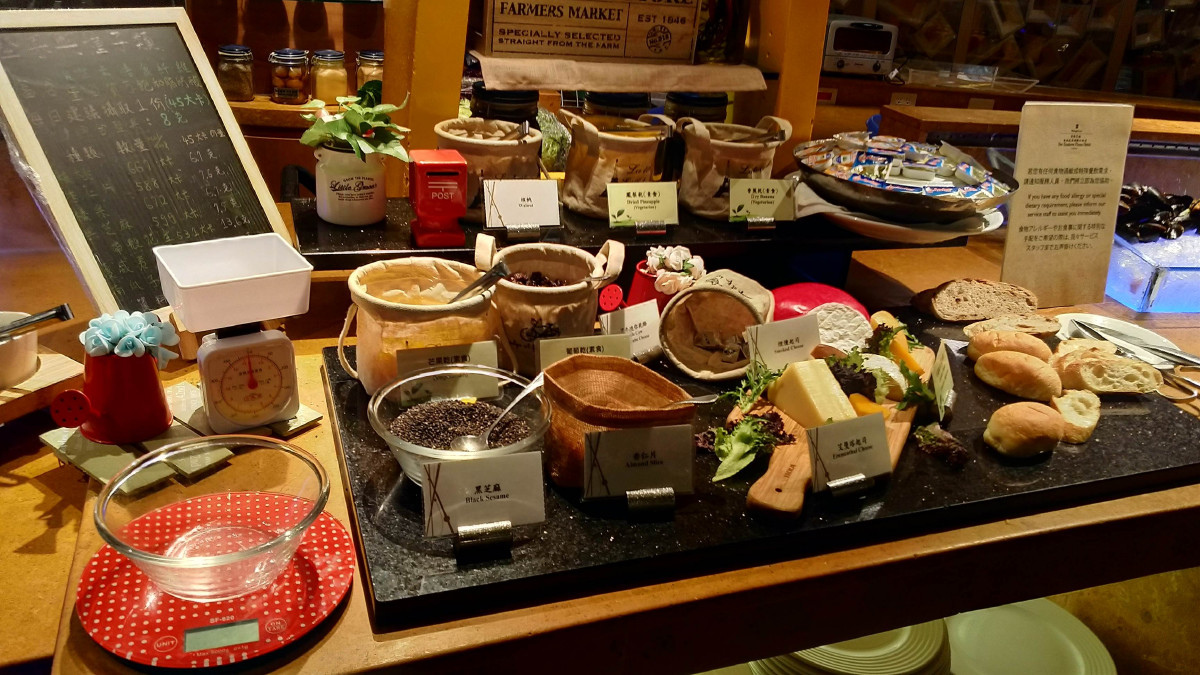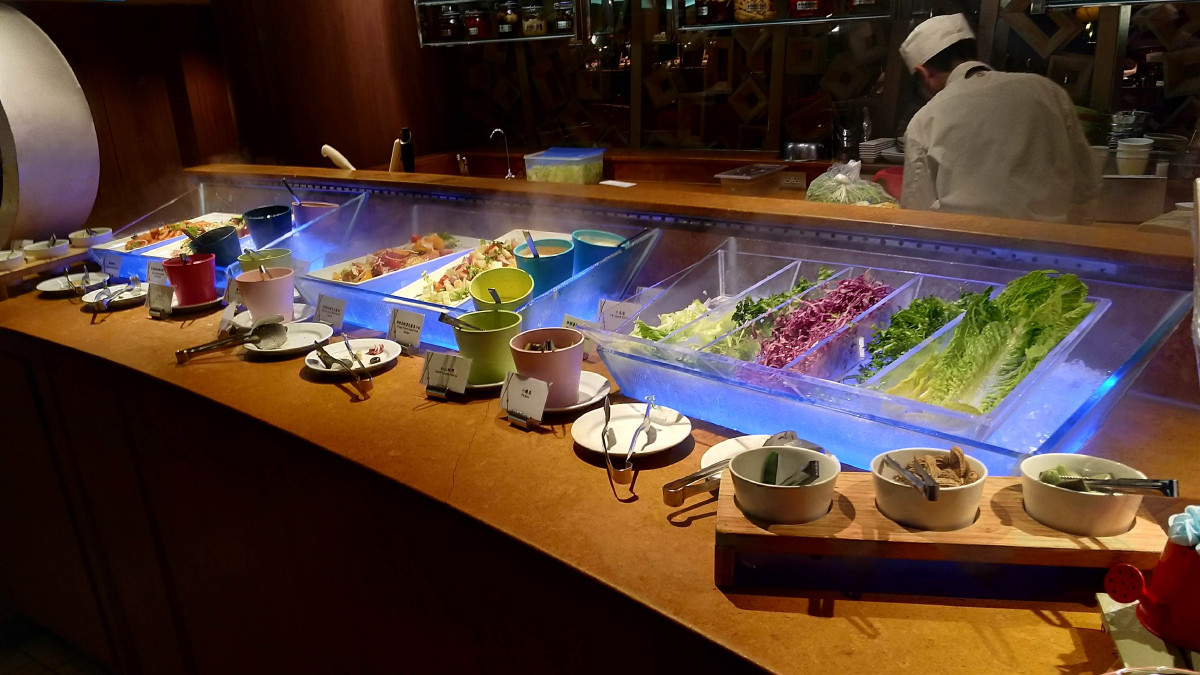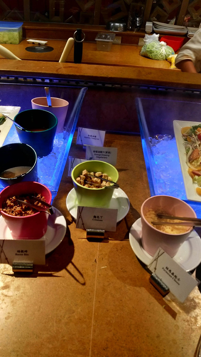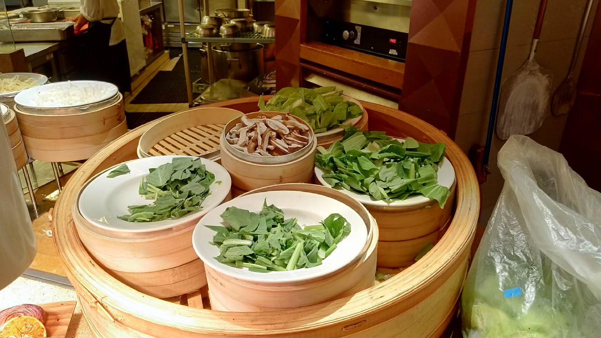 到窗邊的位置。餐廳內各類食材的分布較為分散,因此在取餐的