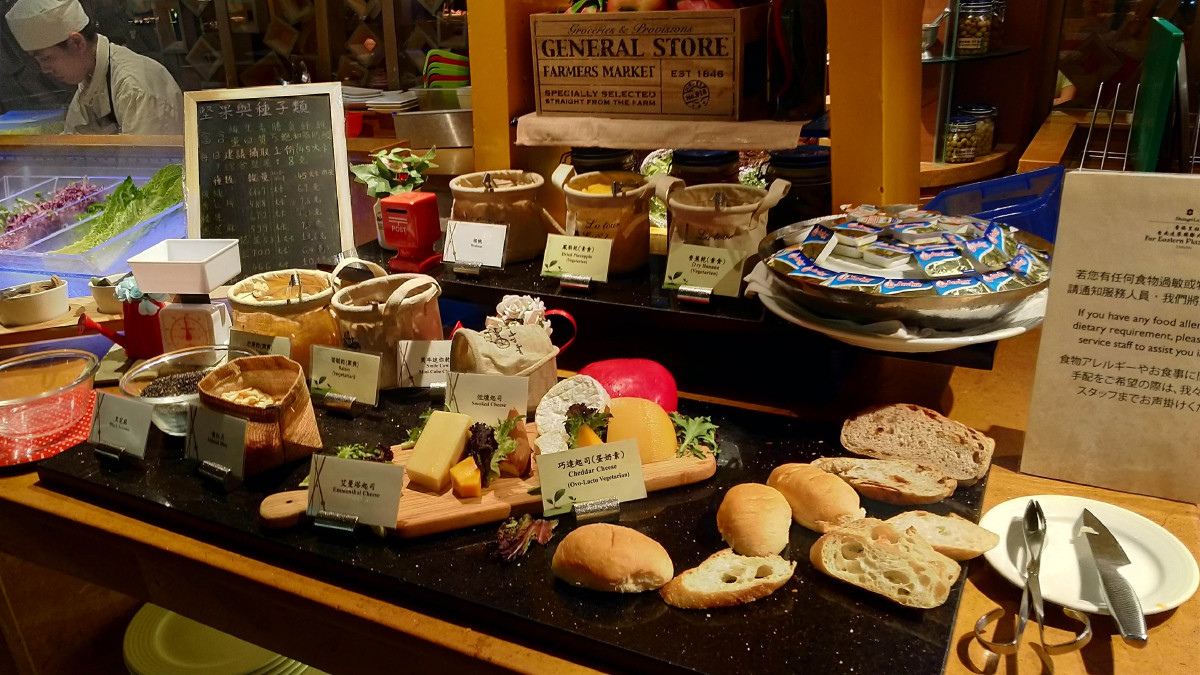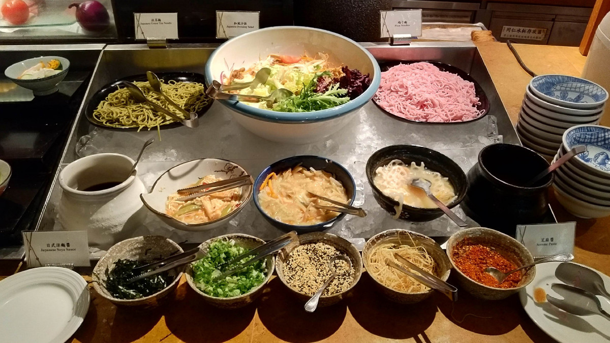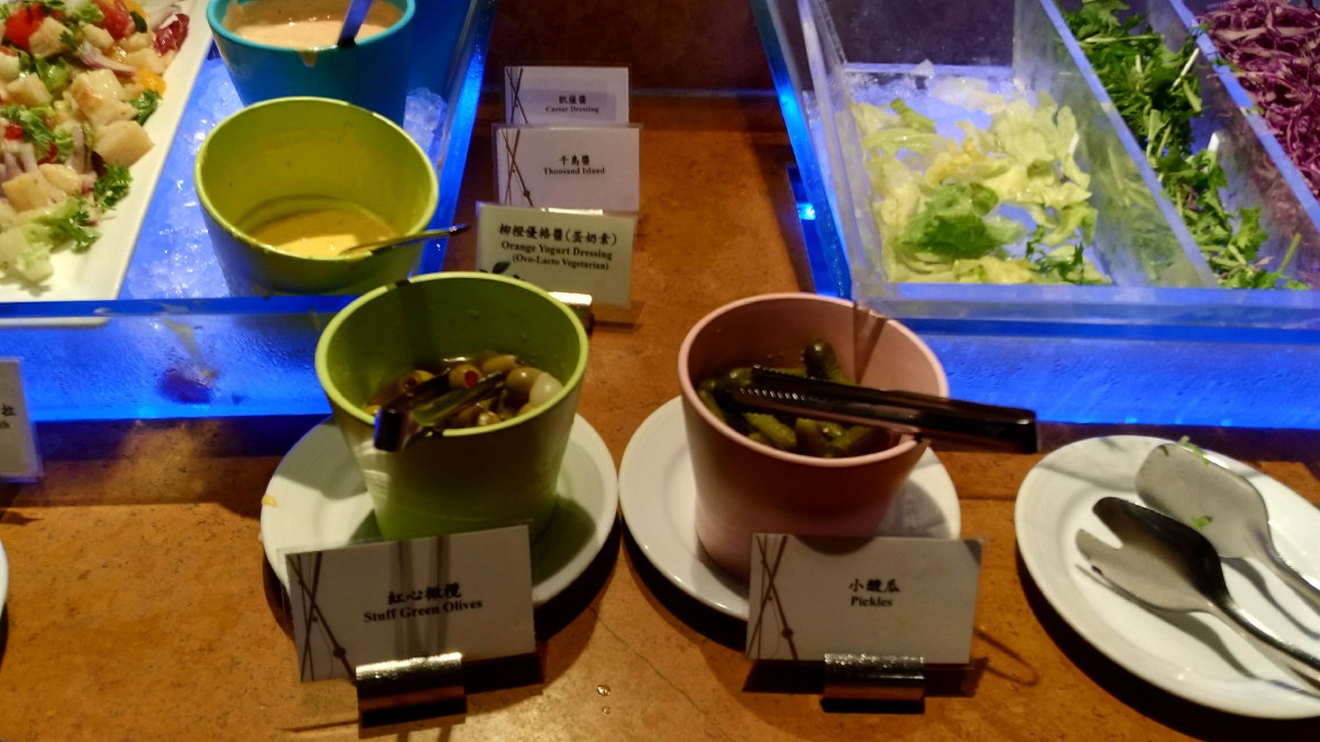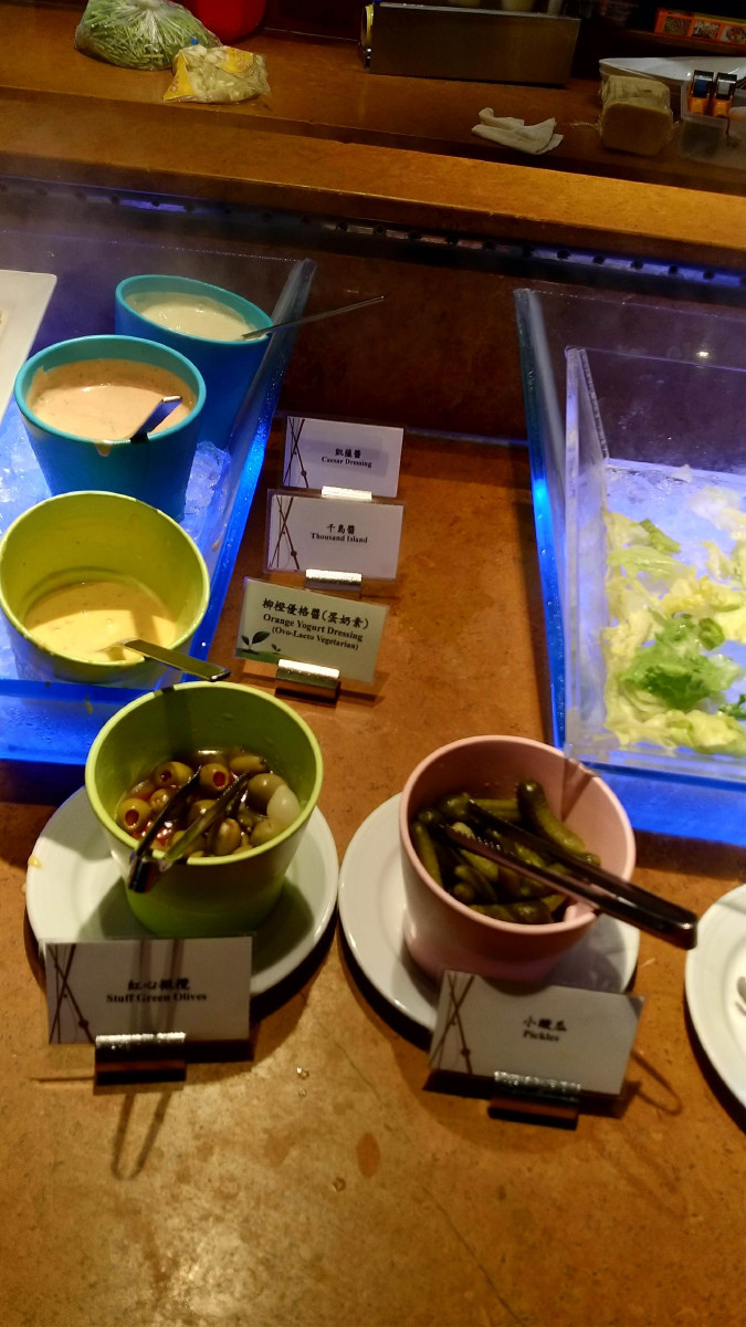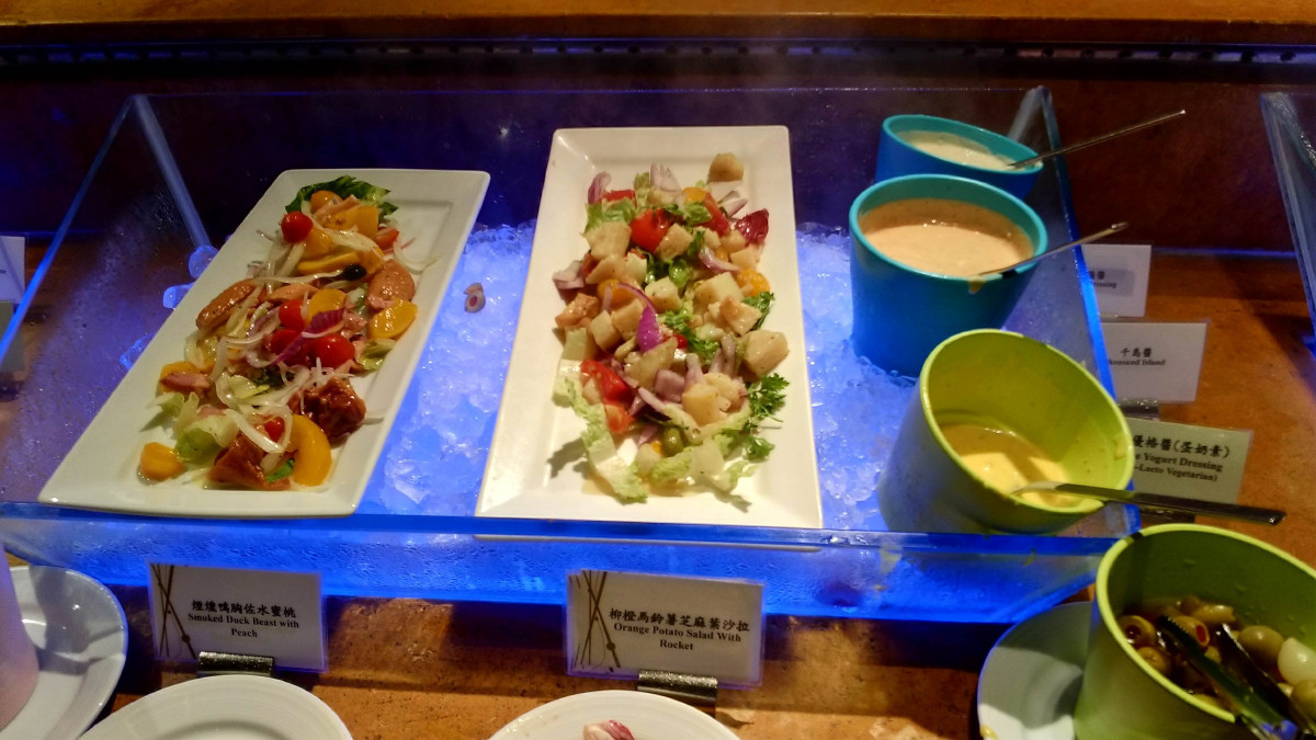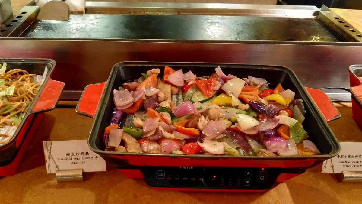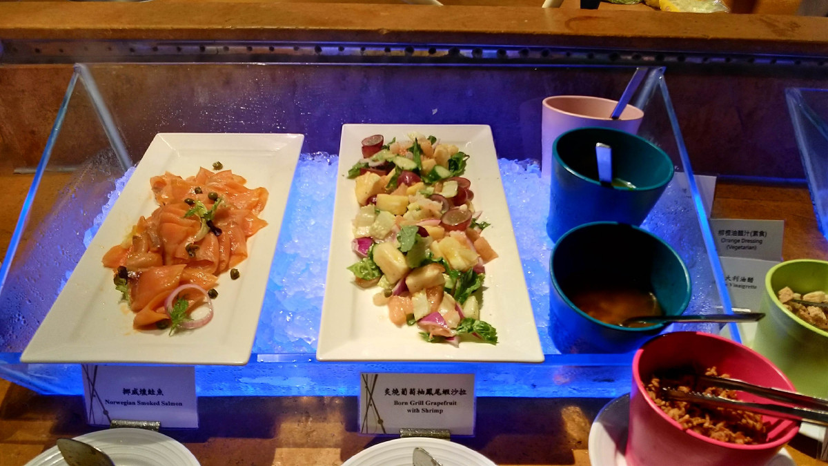 到窗邊的位置。餐廳內各類食材的分布較為分散,因此在取餐的