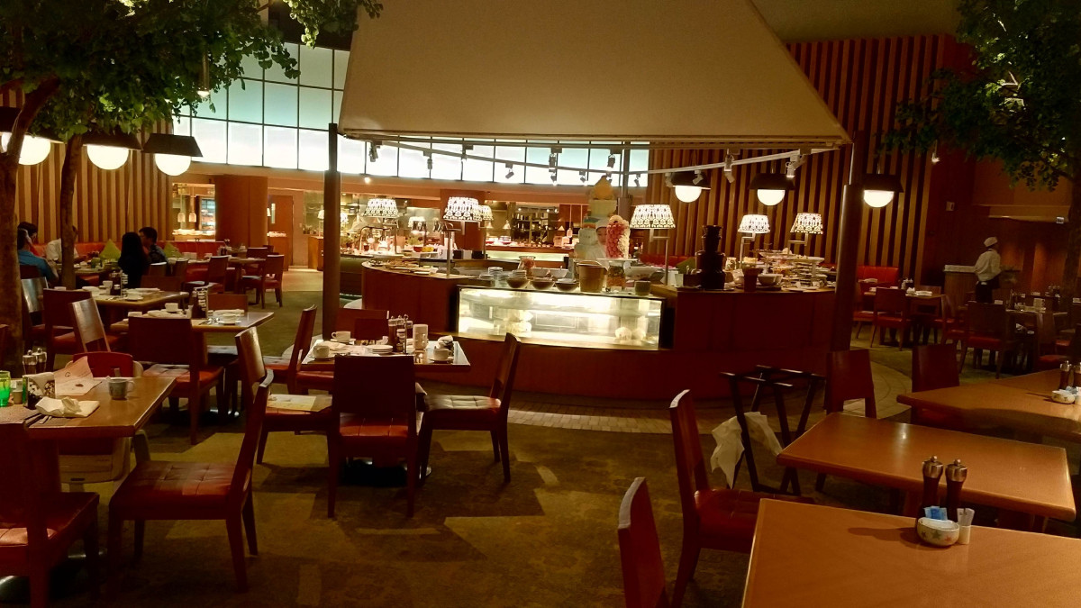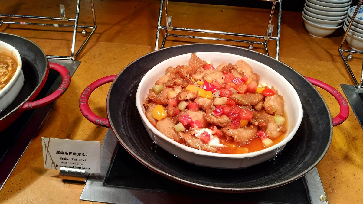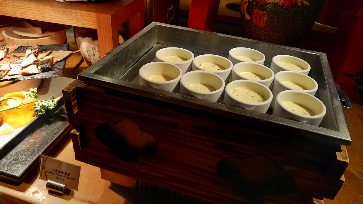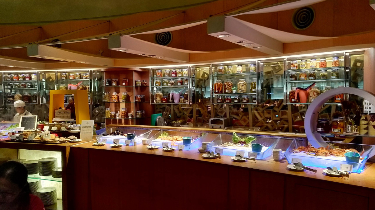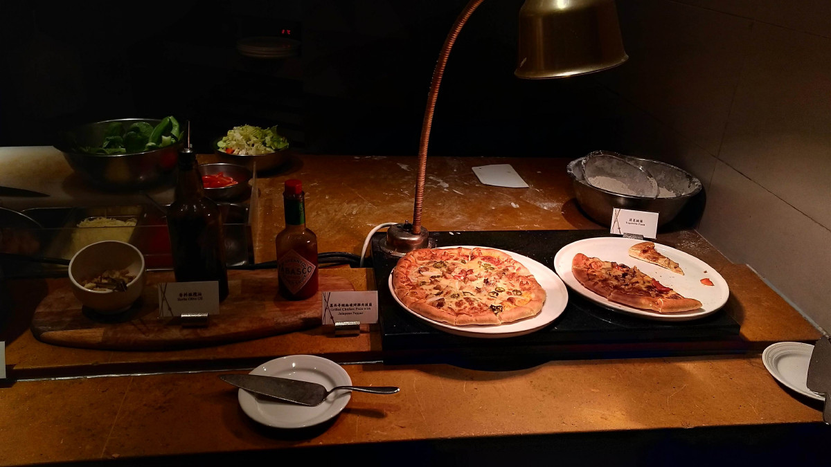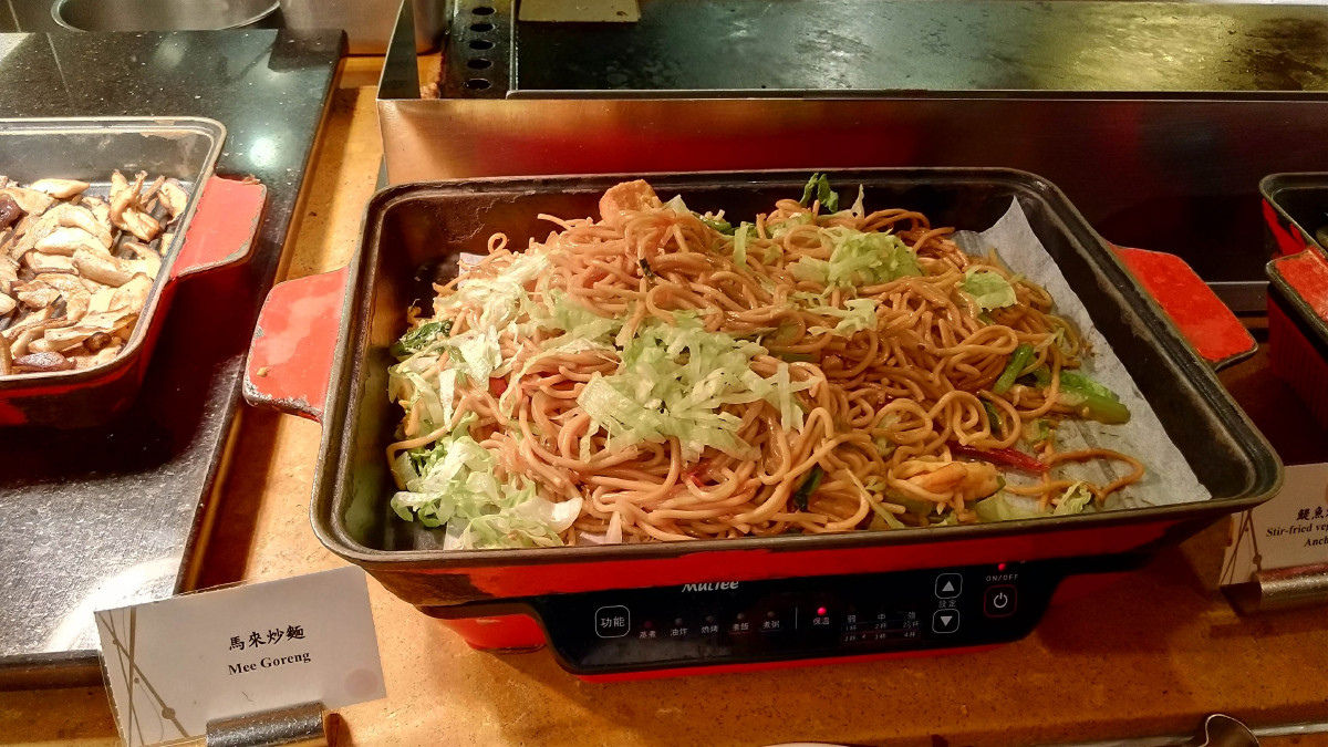 到窗邊的位置。餐廳內各類食材的分布較為分散,因此在取餐的