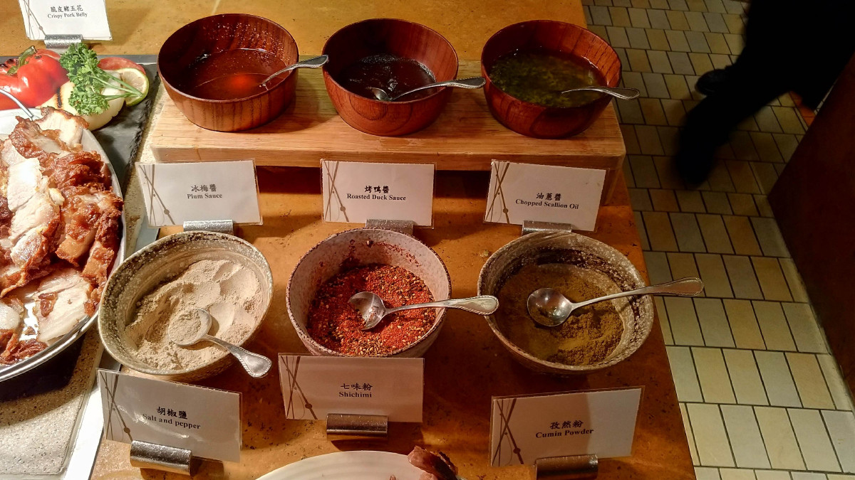 配料與醬汁-提供冰梅醬、烤鴨醬、油蔥醬、胡椒鹽、七味粉與