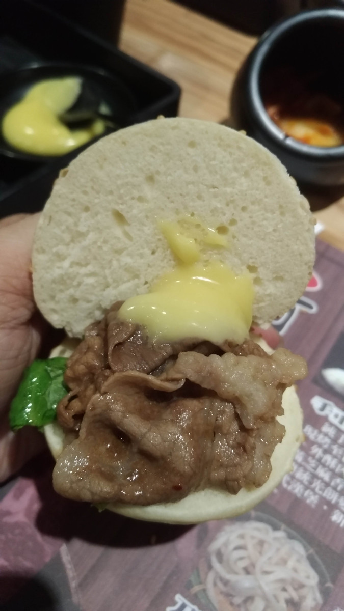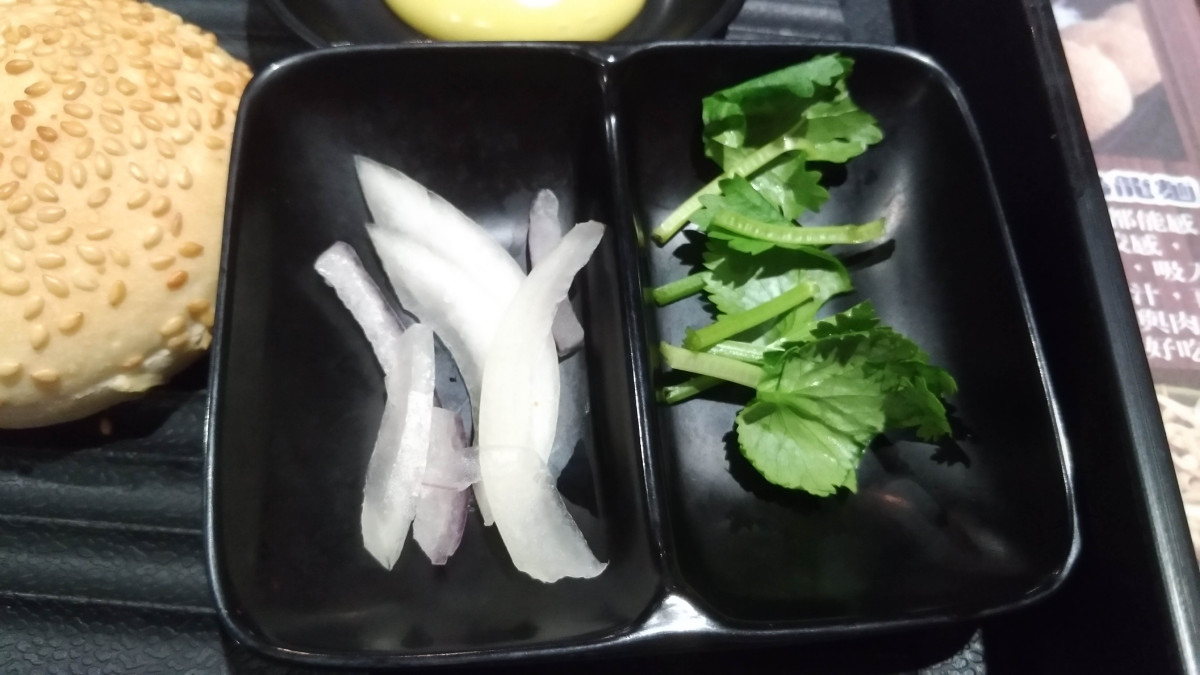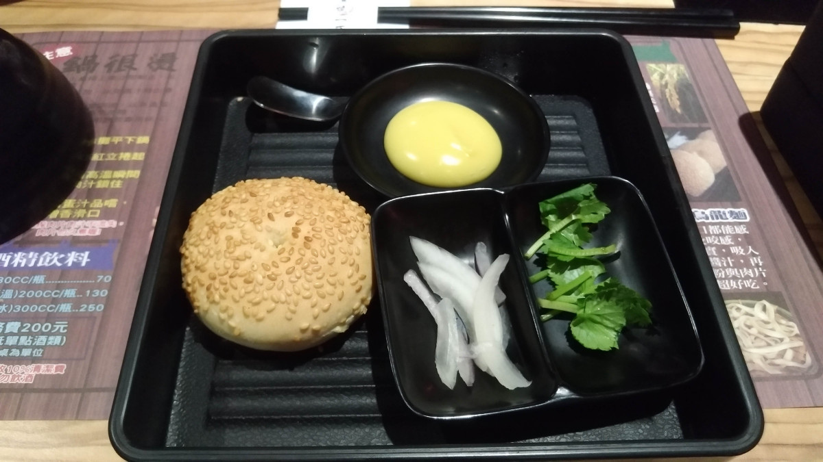 手工光餅-搭配蜂蜜芥末醬與洋蔥和香菜,再夾幾片剛涮好的牛