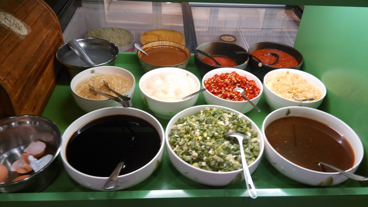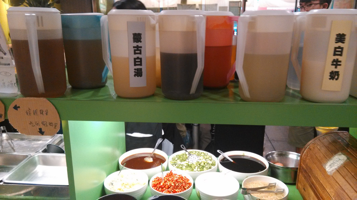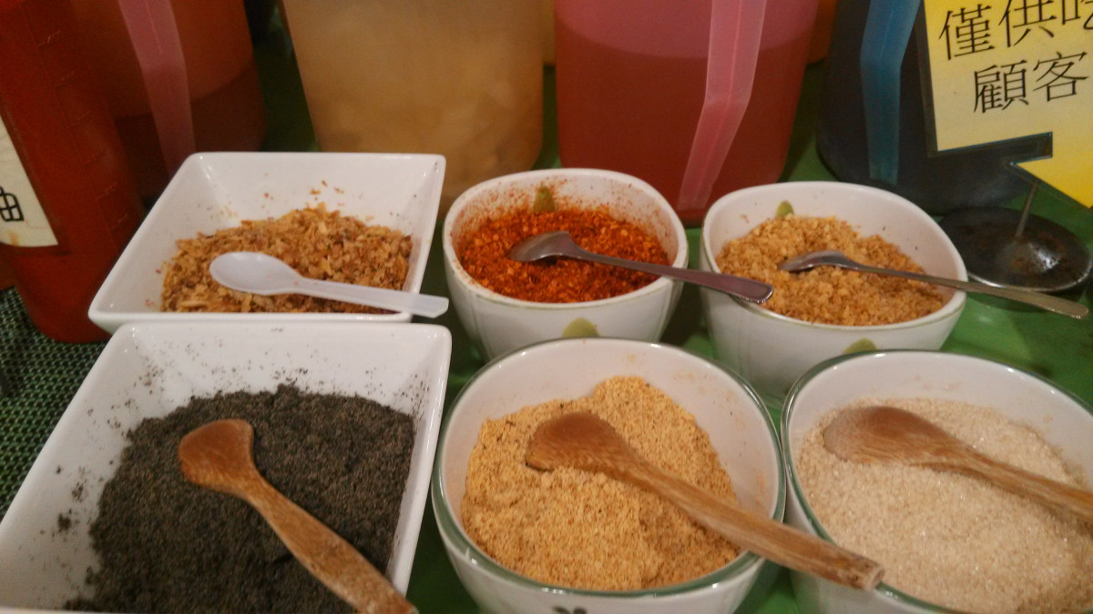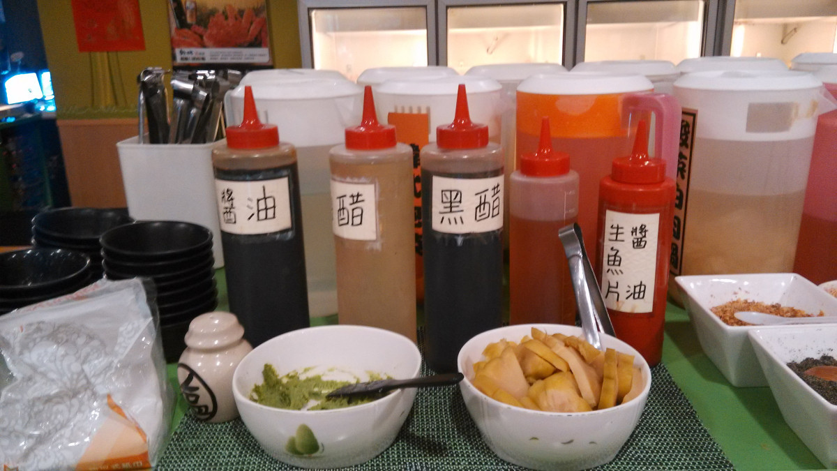 調味料區--提供醬油、蔥花、沙茶醬、薑絲、蘿蔔泥、辣椒、蒜