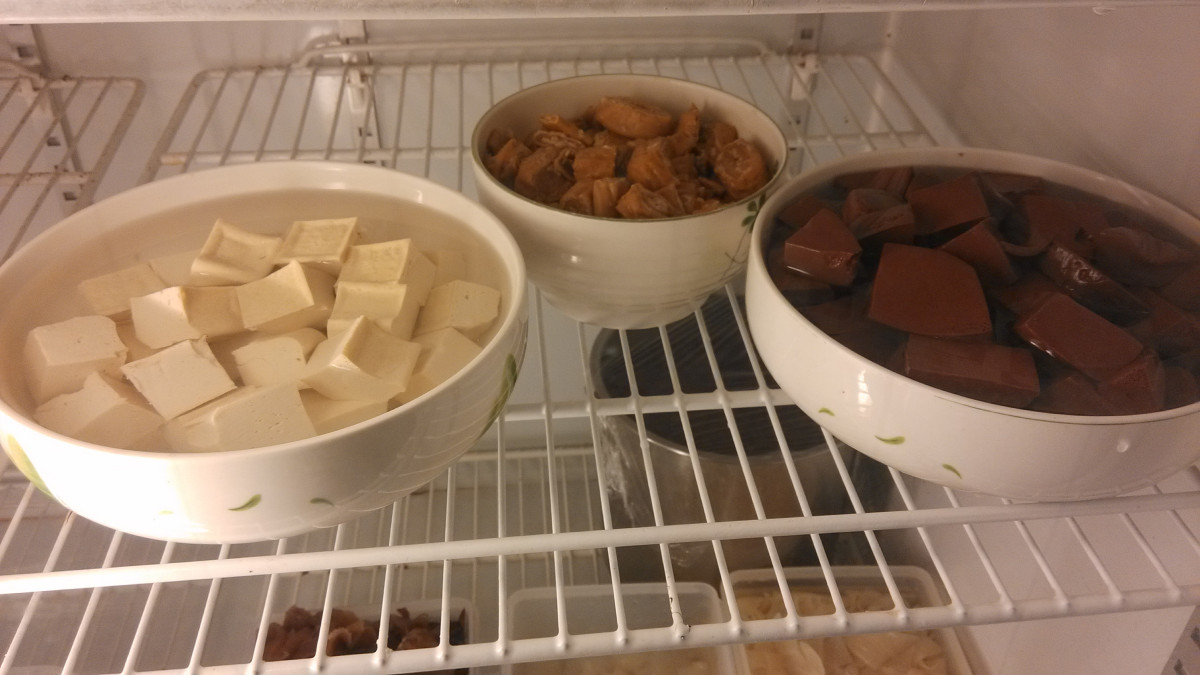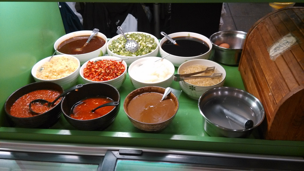 泥、胡麻醬(或是豆乳醬)、辣椒醬與豆瓣醬自由調味,而上方另