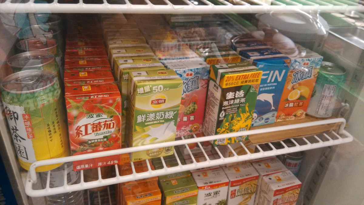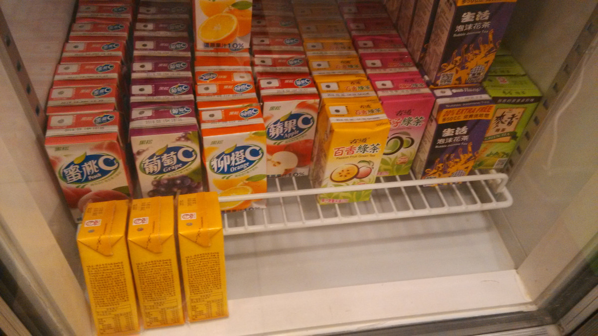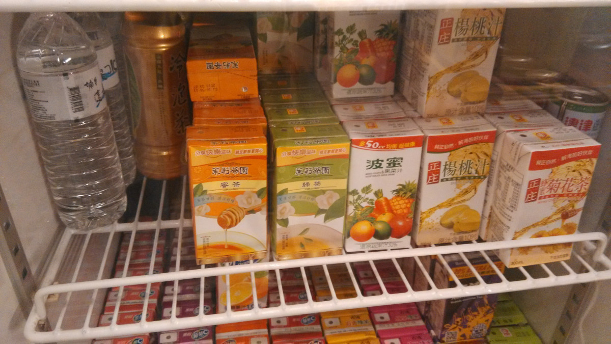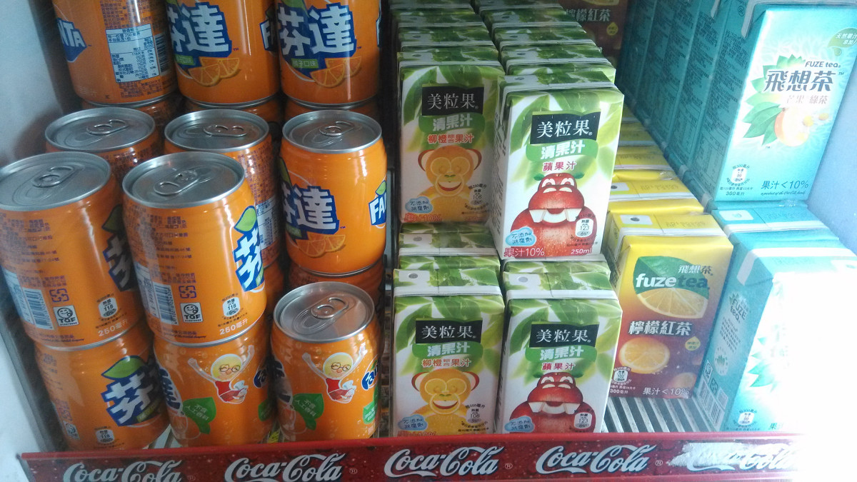 ,還有鋁箔包裝的美粒果柳橙清果汁、蘋果汁跟飛享茶的檸檬紅