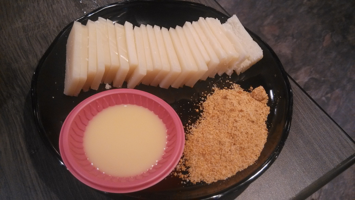 炭烤日式麻糬-份量給得相當的足,但相對只有一小碟的煉乳看