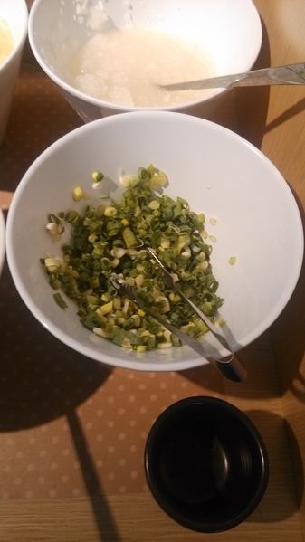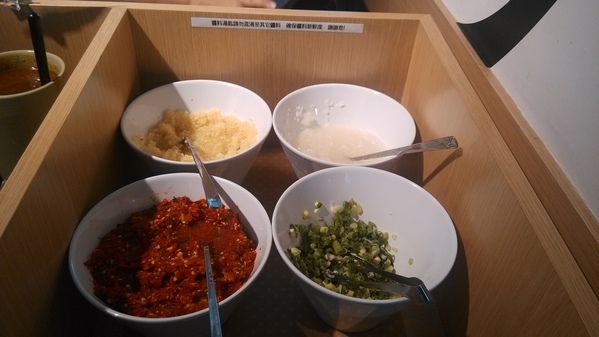 調味料--提供青蔥、蘿蔔泥、蒜、辣椒與醬油、橙醋、味噌醬、