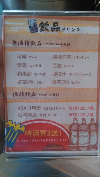 醋、柳橙汁、紅茶(熱)、綠茶(熱)與付費的ASAHI啤酒及台灣啤