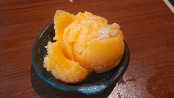 油膩,而另一款的霜降雪花牛口感則是較為柔嫩許多,搭配芒果