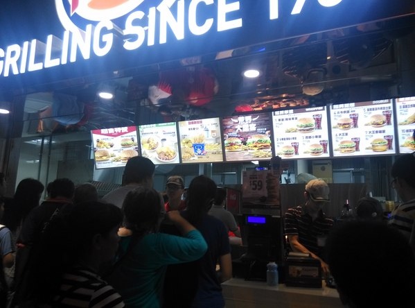 漢堡王點餐櫃檯及看板,不過排隊的人潮還蠻多的,加上座位區