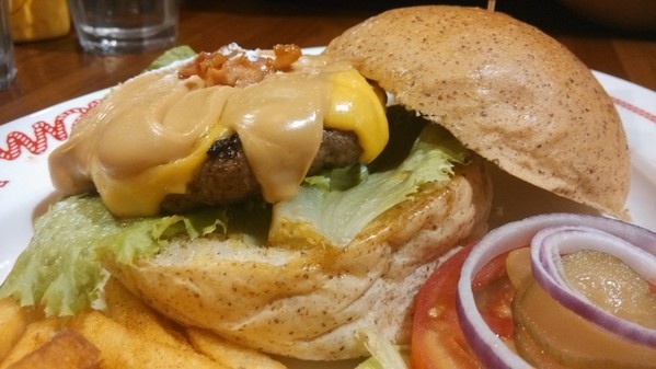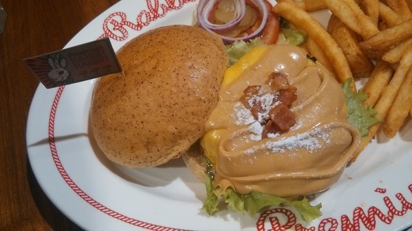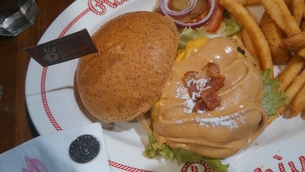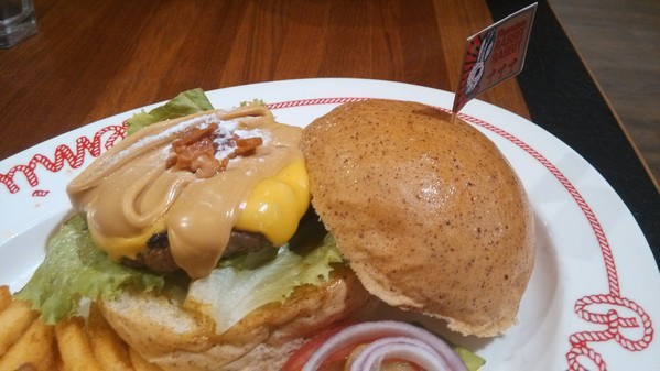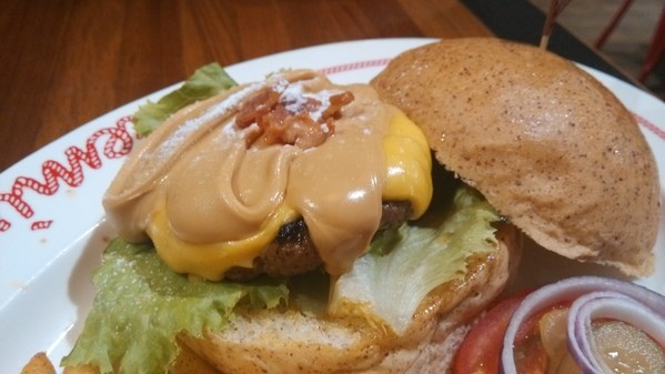 與牛肉漢堡肉、美式切達起司再淋上大量的花生醬後撒點碎培根