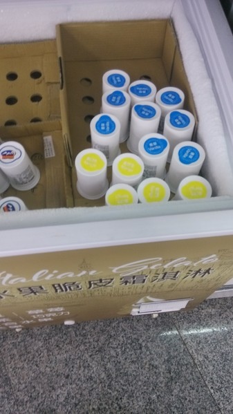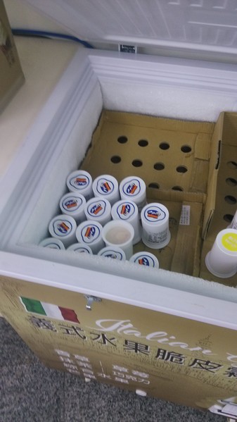 原料杯-各種口味的原料杯都放置在冷凍的櫃子裡裝箱,口味以