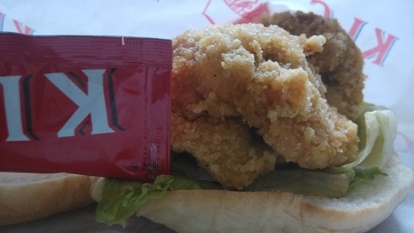 卡拉雞腿堡外觀大小與高度-拿蕃茄醬來做比例,面積大約是四