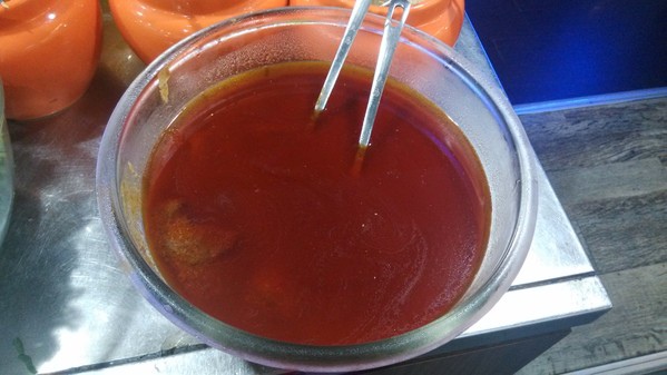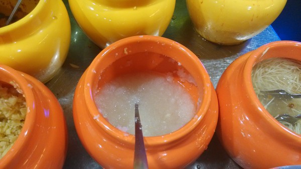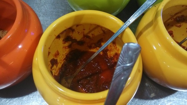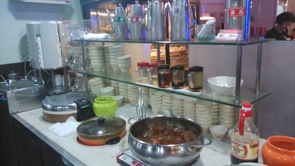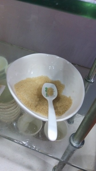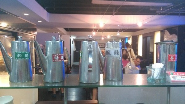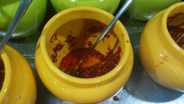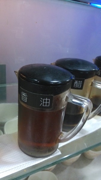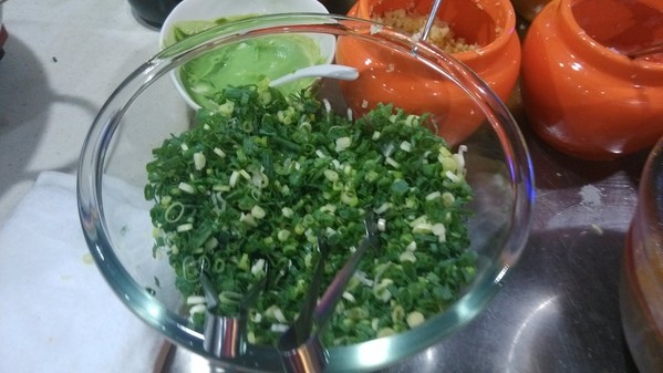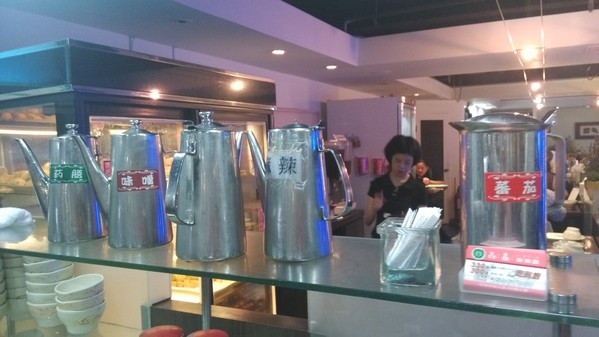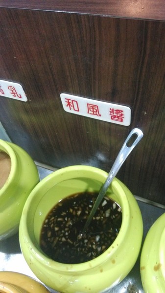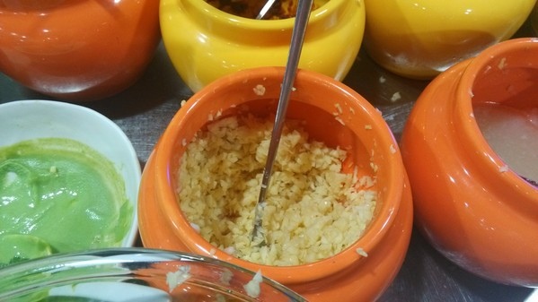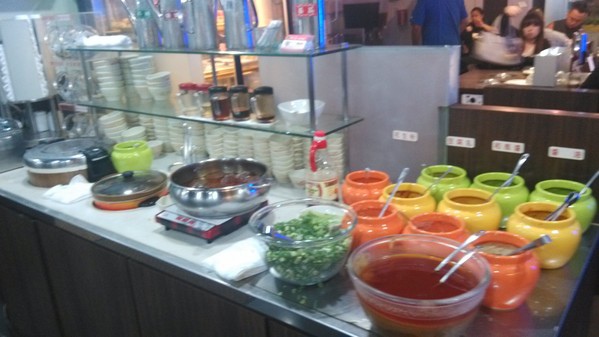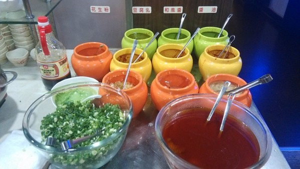 調味料區--有沙茶醬、青蔥、薑絲、蘿蔔泥、蒜末、泡菜、辣椒