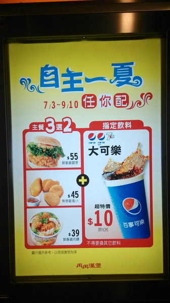 A大杯百事可樂10元優惠價+鮮脆雞腿堡55元+鮮脆雞腿堡55元--->120元