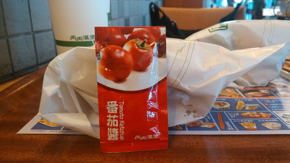鮮脆雞腿堡外觀高度-拿蕃茄醬包來做個比例,高度大約是十分