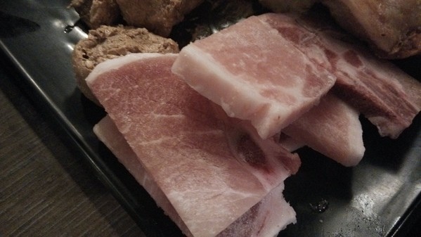 豬頰肉-油花的分布稀少,吃起來算是蠻有咬勁甚至有點脆度的