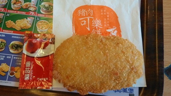 豬肉可樂餅實體大小-拿蕃茄醬包來做個比例,面積大約是三包