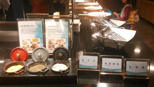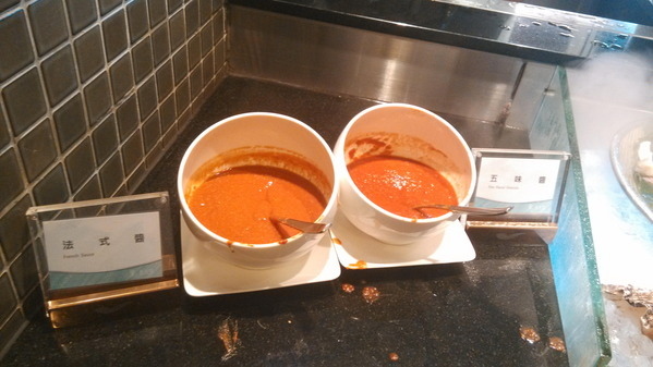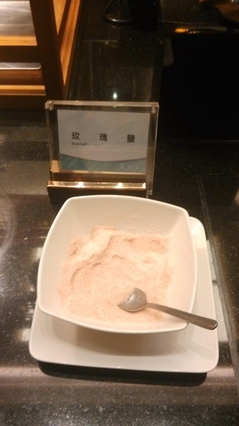 有紅酒牛肉汁、黑胡椒醬、蘑菇醬及玫瑰鹽做為排餐的調