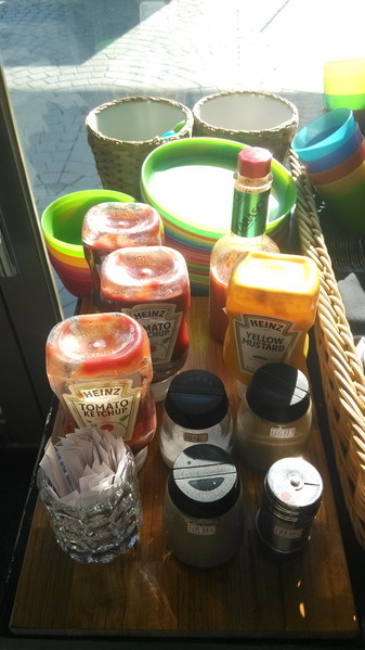 料的部份也有蕃茄醬、辣椒醬、芥末醬、胡椒粉、辣椒粉可以使