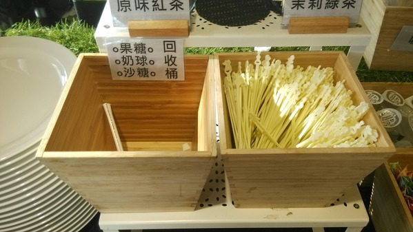 奶精、糖包、果糖-旁邊還貼心的放置了回收桶可以把用完的包