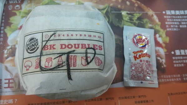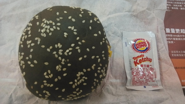 漢堡王蒜味雙牛黑皮堡實體大小-面積約有三包多左右的蕃茄醬