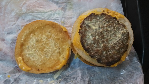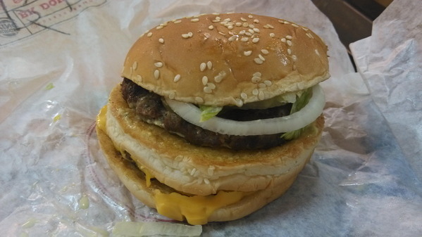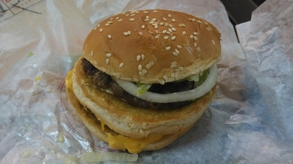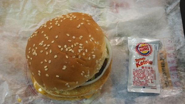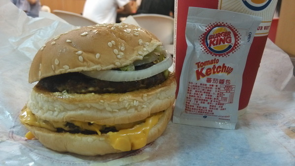 、大王醬汁、雙層火烤牛肉以及印像第一次漢堡王中間的一片麵