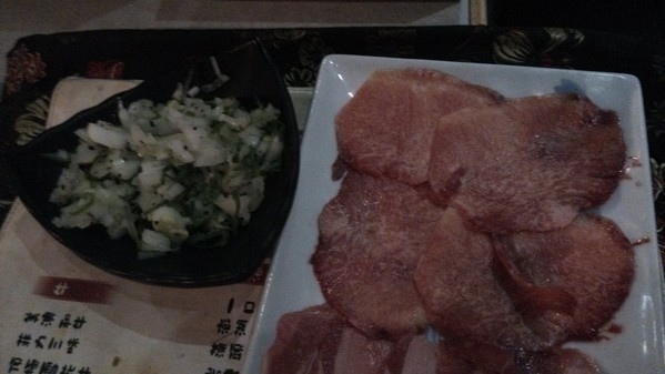 洋蔥沙拉裡的生牛肉或是牛舌或豬舌包起來食用,味道都相當的