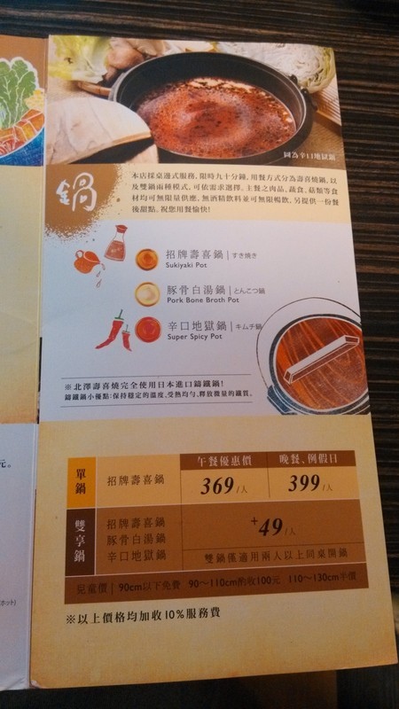 鍋物--招牌壽喜鍋,另外也可以加價選擇雙人鍋的豚骨白湯鍋或