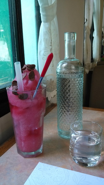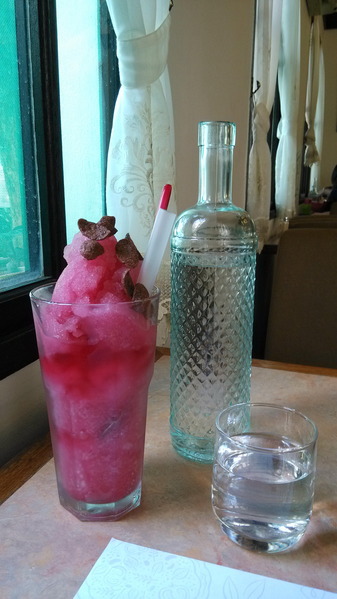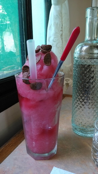 綜合梅果冰砂一粉紅色的鮮豔色彩,搭配巧克力脆片,鬆脆又冰