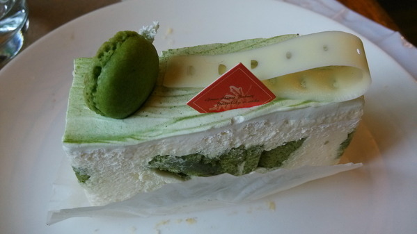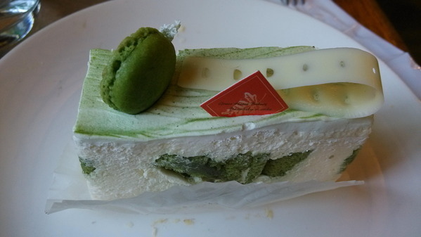 抹茶蛋糕-淡淡的抹茶粉加上超甜的馬卡龍裝飾在抹茶蛋糕上,