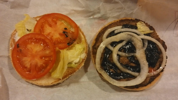 由漢堡麵包加上生菜、洋蔥、黑芝