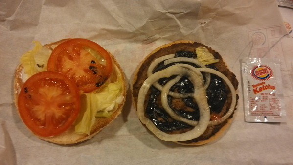 在食材的部份,由漢堡麵包加上生菜、洋蔥、黑芝麻醬、美乃滋