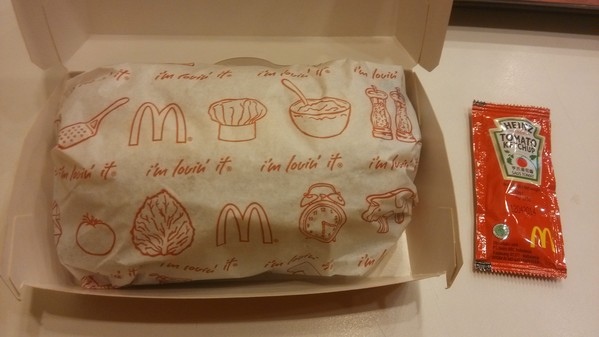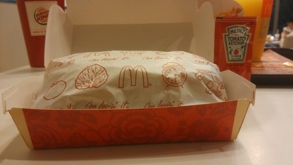 麥當勞招財福堡牛肉堡包裝-拿蕃茄醬包在旁邊做比例,面積大