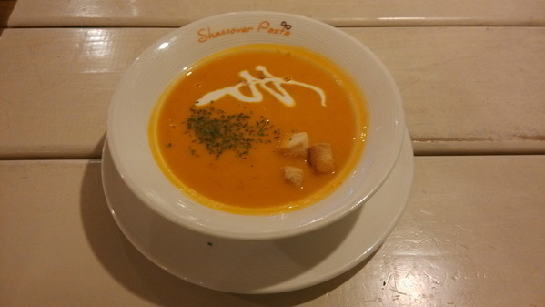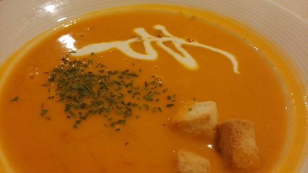 南瓜濃湯-淡淡的南瓜香味與濃稠的湯頭,白色的部分應該是鮮