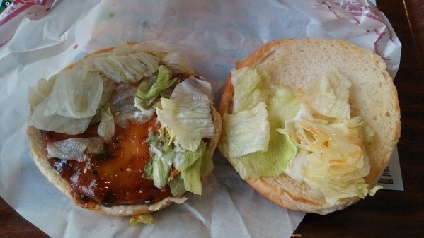 烤醬雞堡實體高度-實體的高度大約有五分之三左右的蕃茄