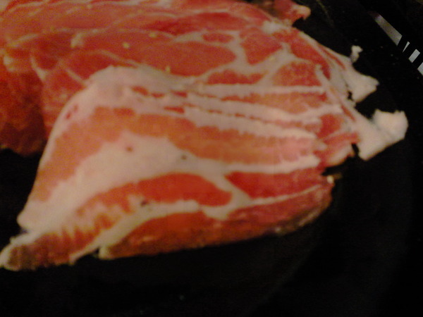宜蘭鹹豬肉-口味相當的重鹹,肥瘦肉各占約一半,雖然烤完吃