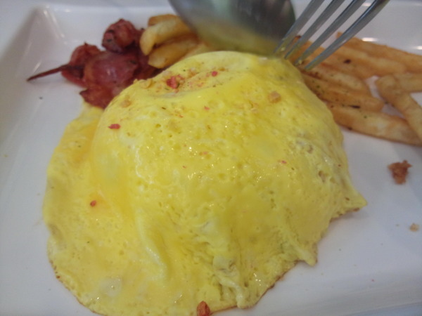 培根薯條蛋蛋飯-香軟的蛋皮包覆著軟Q白飯,淋上醬汁後吃起來味