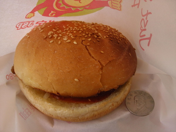 豬肉漢堡實體大小-手邊拿個面積比較大的10元銅板做個比例
