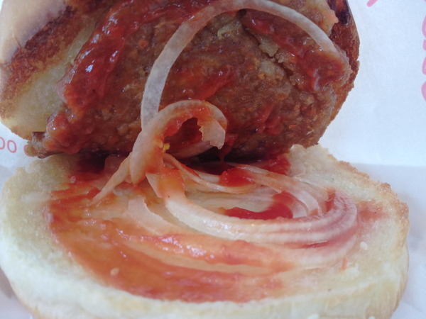 豬肉片與一些洋蔥及蕃茄醬,簡單的一個豬肉漢堡就這樣完成了