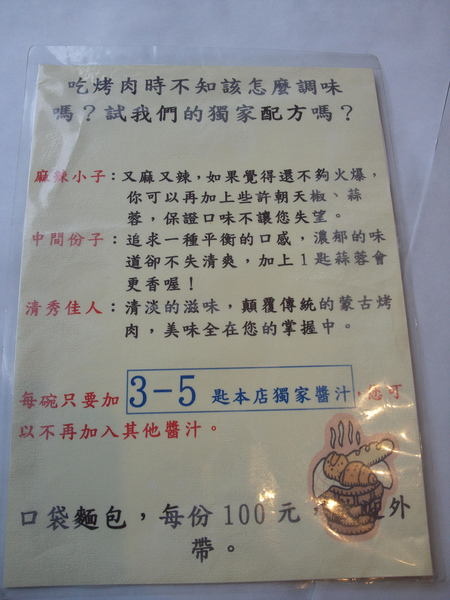 這邊應該是以吃蒙古烤肉為主,容易占胃置的的口袋麵包基本上可以吃