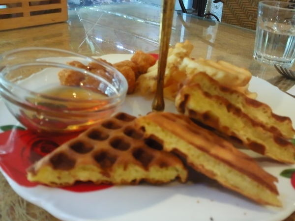 花則是還不錯吃,鬆餅是現做的所以剛出爐口感鬆脆好吃,淋上