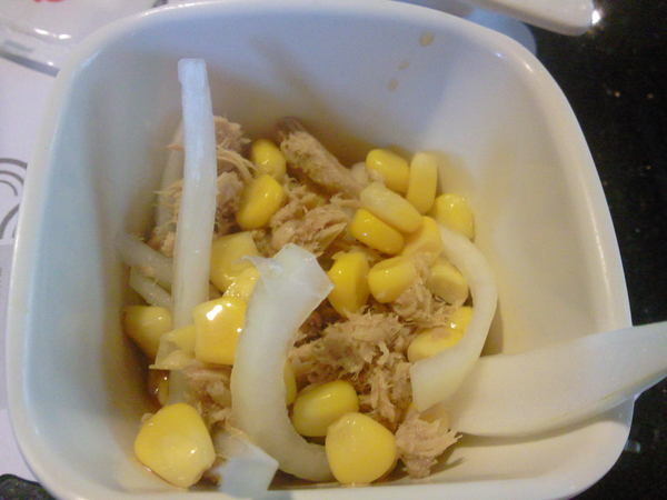 鮪魚洋蔥沙拉-鮪魚口感較乾,搭配份量不多的玉米粒,主要還是在吃