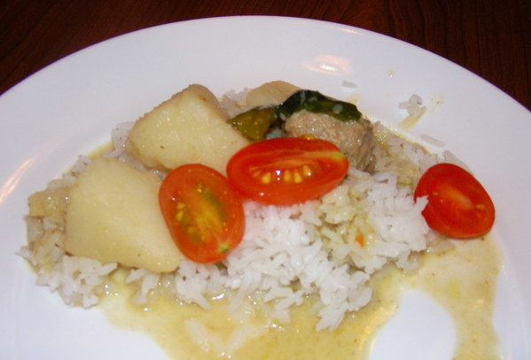 南洋綠咖哩飯-裡面最不辣的咖哩加上馬鈴薯蕃茄淋在泰式的米飯上面