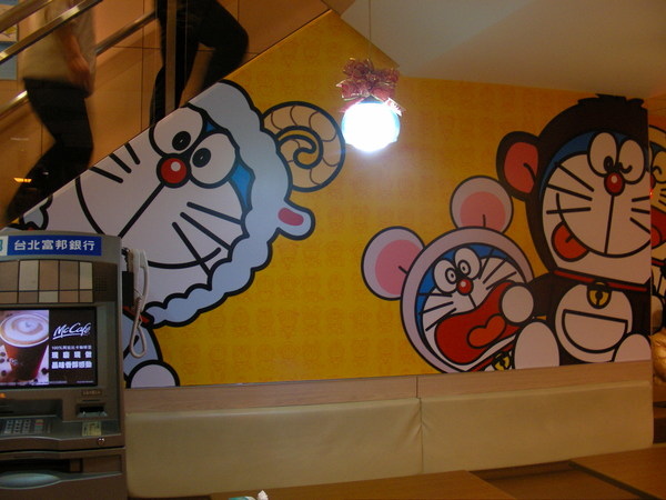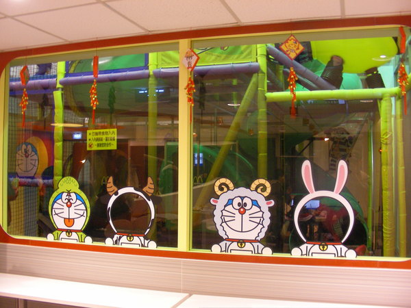 就近一看,二樓的奇趣樂園則貼了幾隻的哆啦來應應景