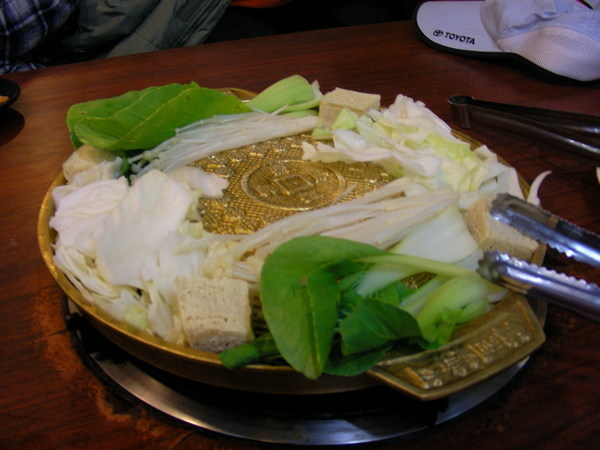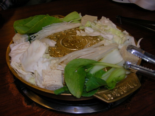 銅盤燒--一開始的銅牌會提供金針菇、凍豆腐、青江菜