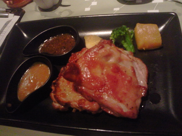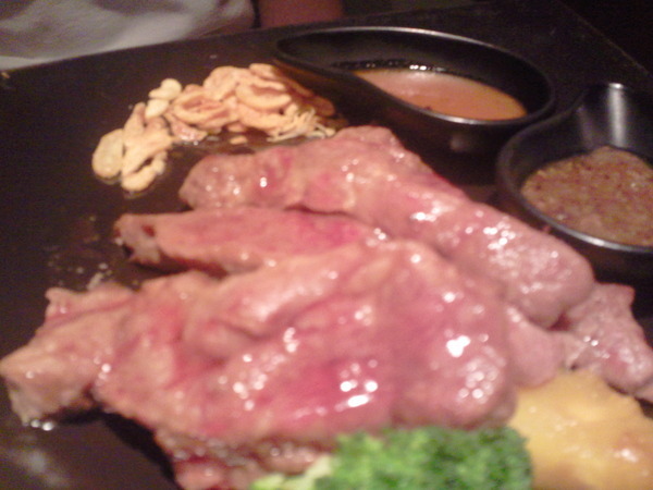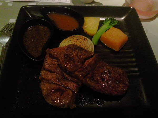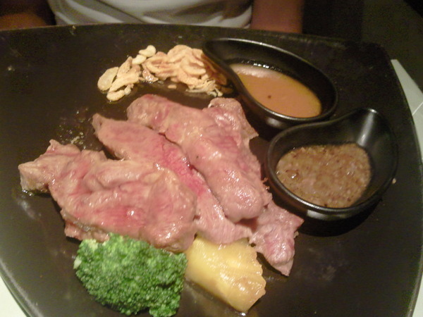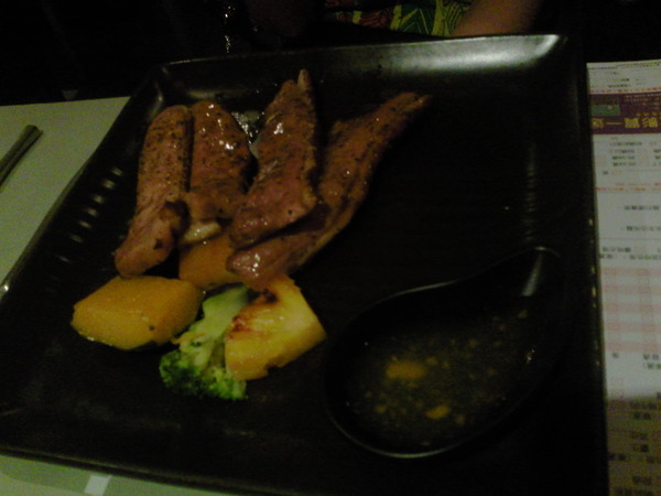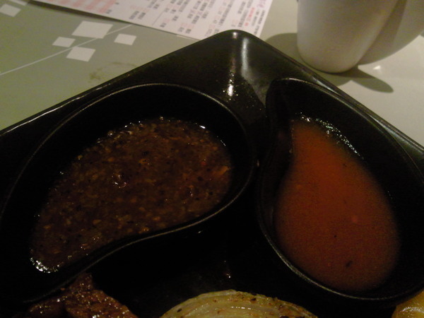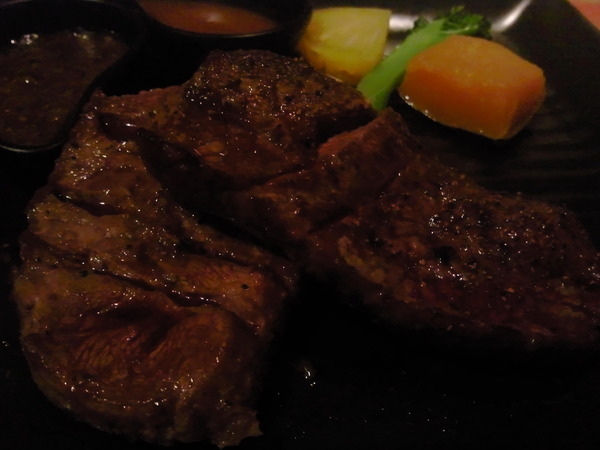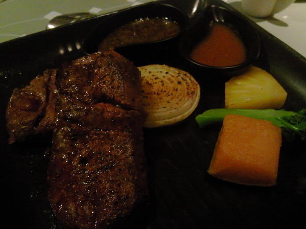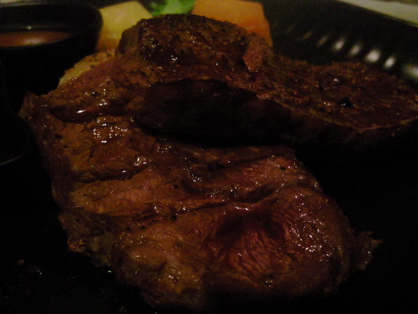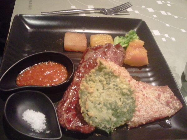 以來試試,五分熟的肉質灑上些許的海鹽、再沾點黑胡椒醬汁,